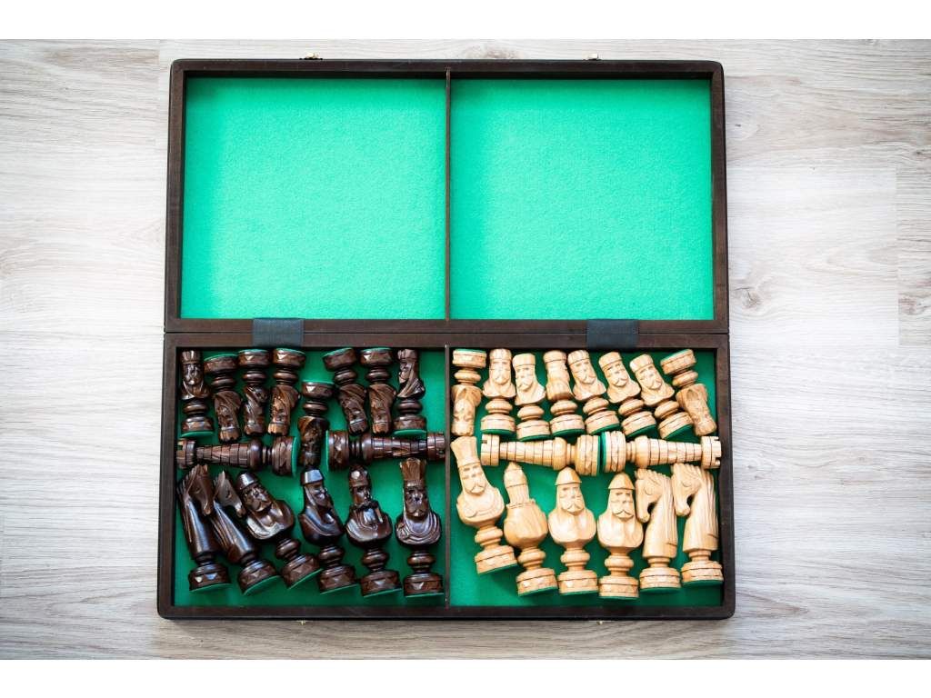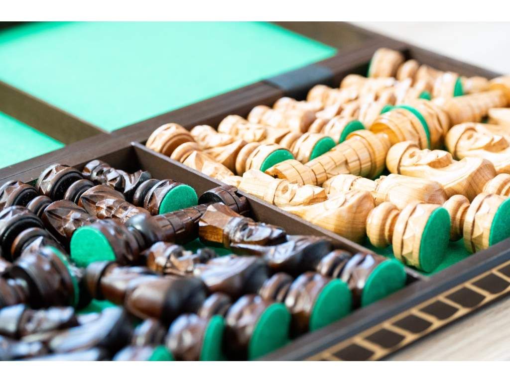 Každá figurka je ručně vyřezávaná s důrazem na detail, aby působila impozantně a zároveň harmonicky. Jejich klasický design inspirovaný honosným a aristokratickým stylem dodává hře výjimečný charakter. Masivní dřevěná šachovnice, zdobená precizními detaily, dotváří celkový luxusní vzhled této soupravy a nabízí ideální herní prostor pro strategické souboje.