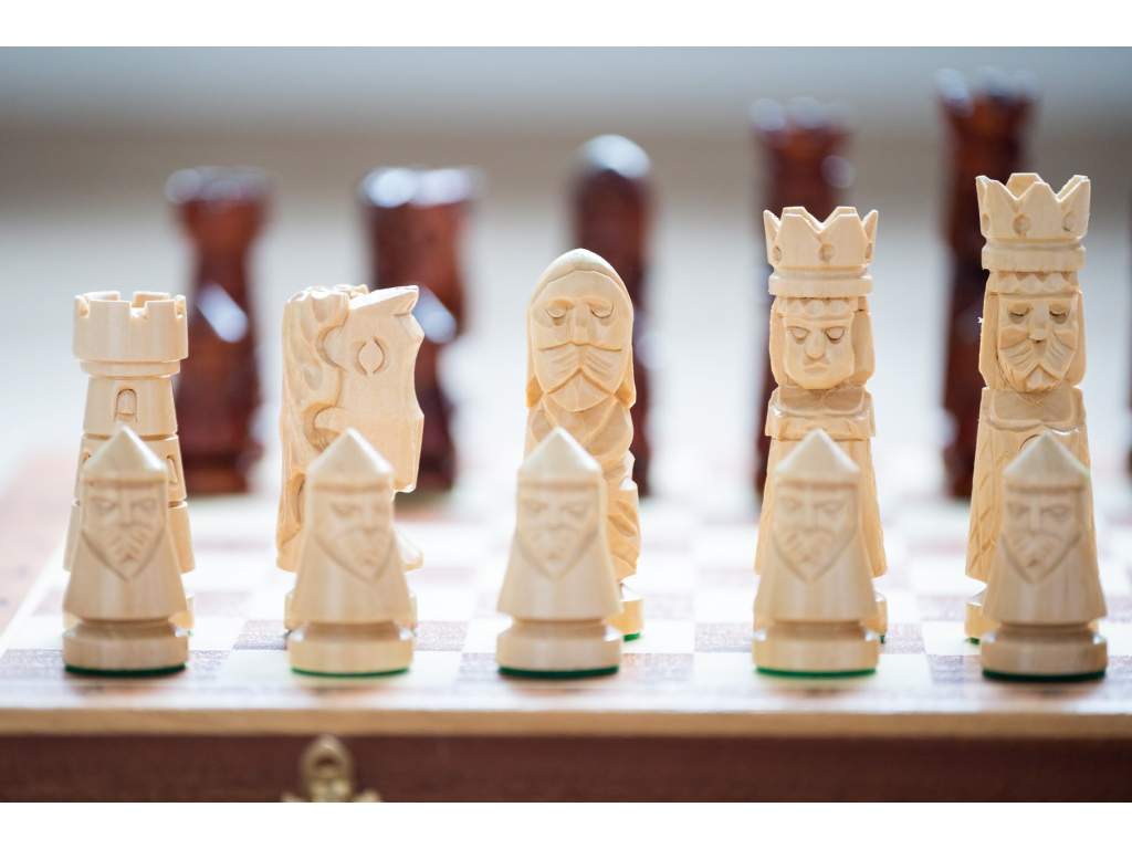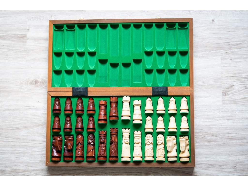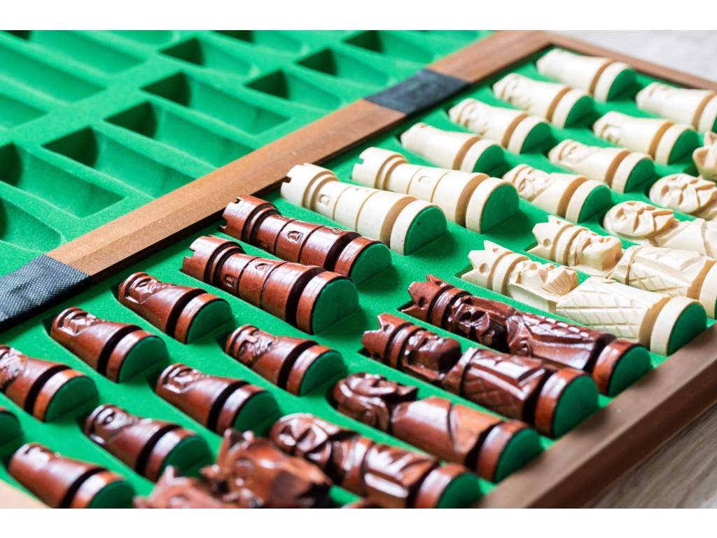 Ručně vyřezávané figurky. Šachovnice vyrobená z mahagonu a patanu.