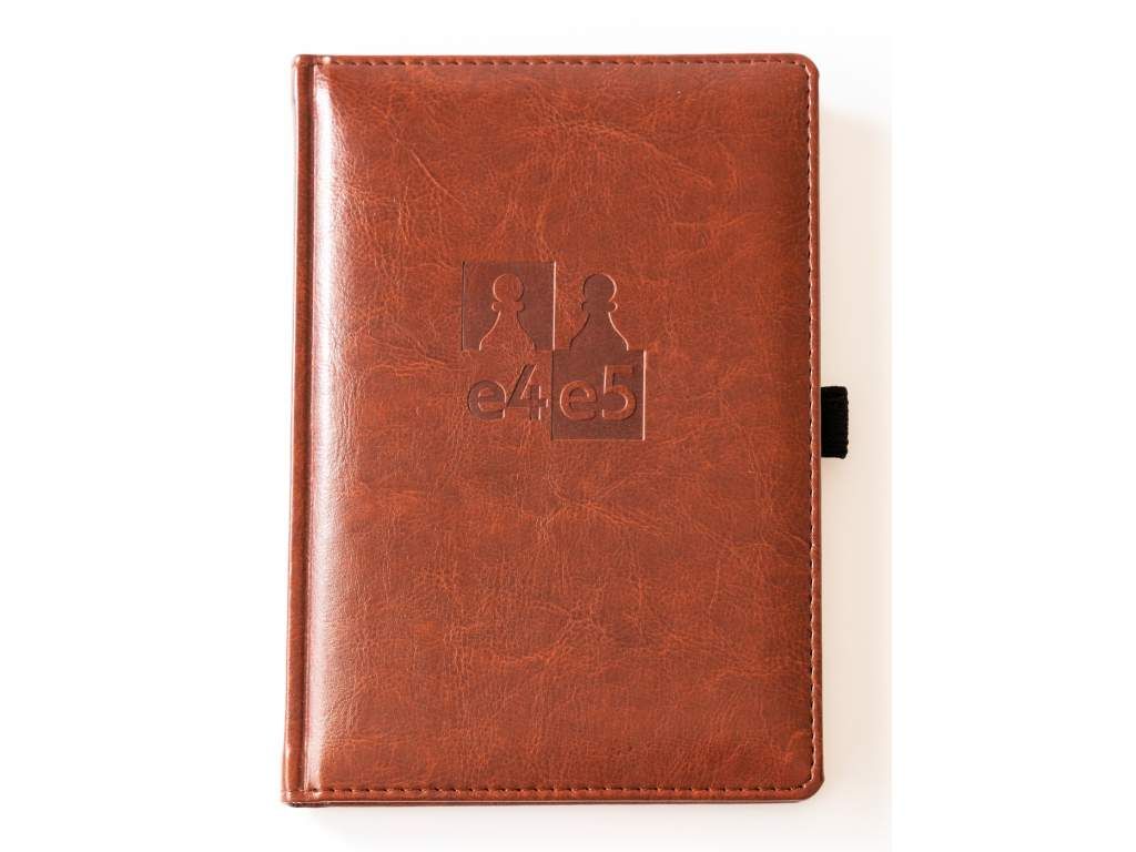 Kvalitní zápisník s koženkovým obalem a vyraženým logem e4e5. Zápisník se uzavírá jednoduchým přehozením gumičky a obsahuje držák na pero, díky kterému budete mít pero vždy u zápisníku.