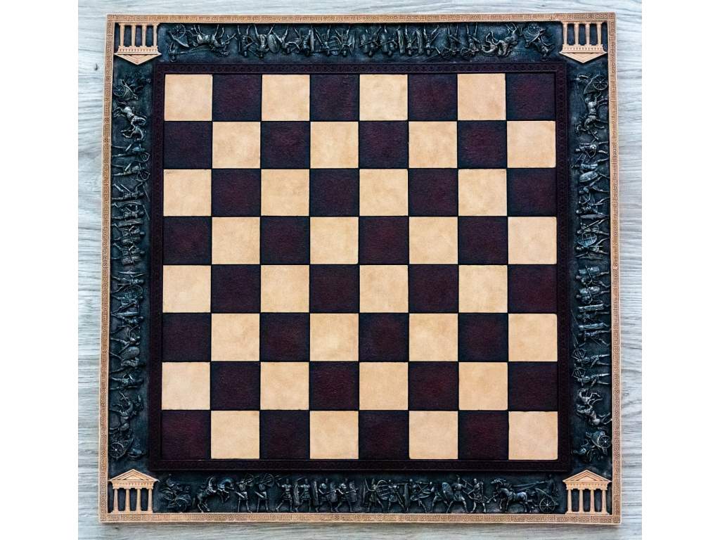 Šachovnice z tvrzené pryskyřice a kovu. Po stranách je ozdobný rámeček s motivem římské legie. Ruční výroba.