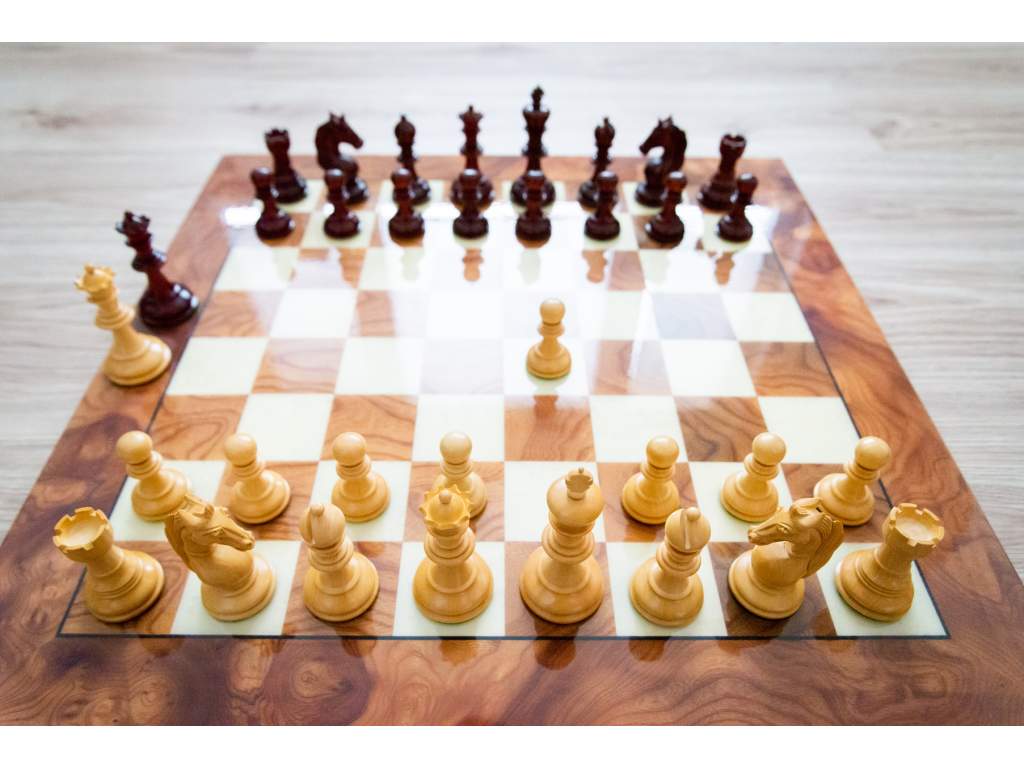 Figurky jsou vyrobeny z červeného dřeva padauk, zatímco bílé jsou vyrobeny ze zimostrázu.