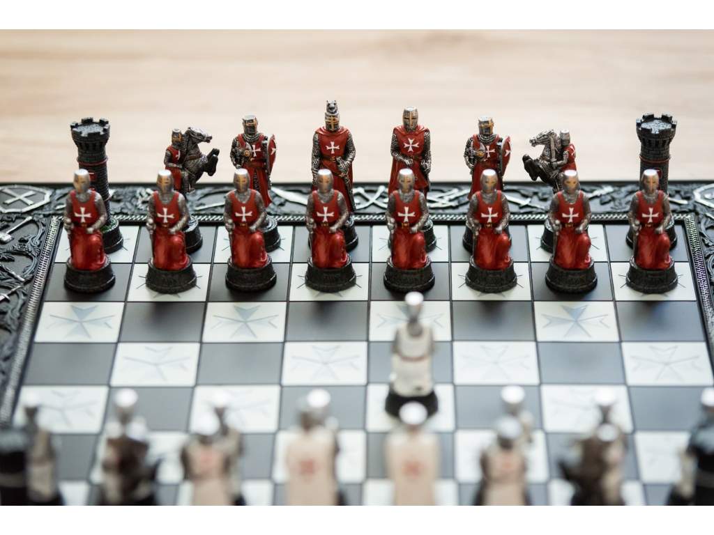 Ručně malované šachové figurky s motivem křižáckých bojovníků dodají šachové partii nádech historie. Šachovnice na motivy křižáckých výprav vyrobená s pryskyřičným základem.