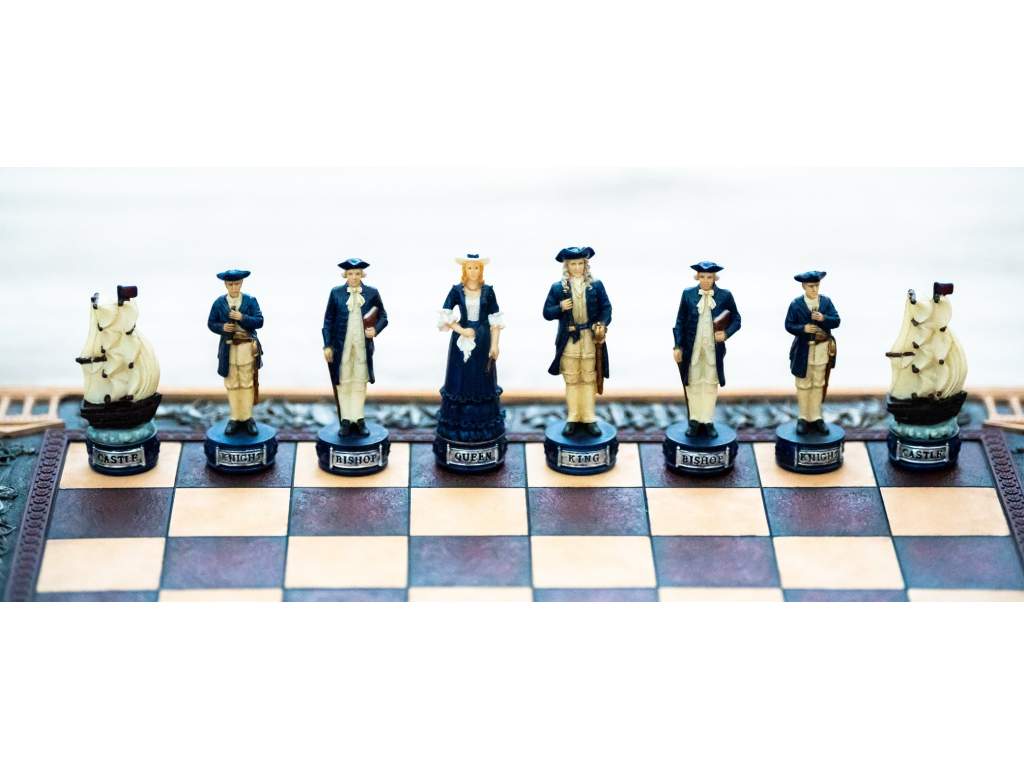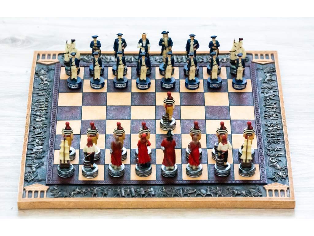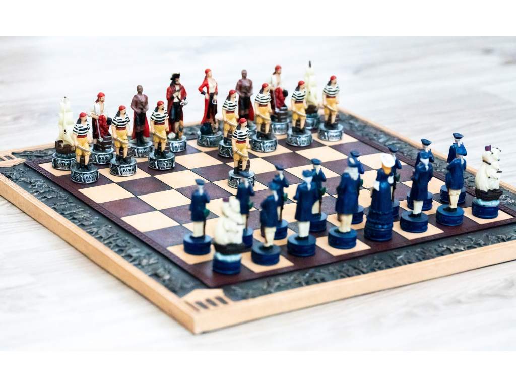 Ručně vyráběné šachové figurky z tvrzené pryskyřice se vzorem námořníků a pirátů. Tato sada potěší každého milovníka námořních bitev.