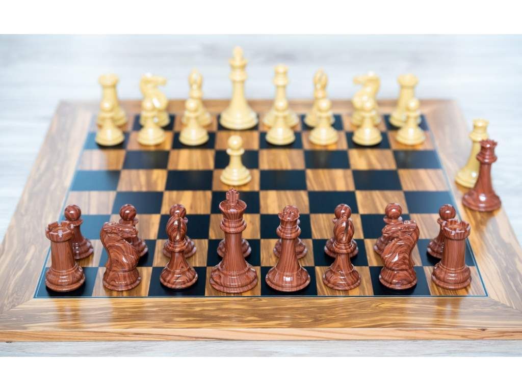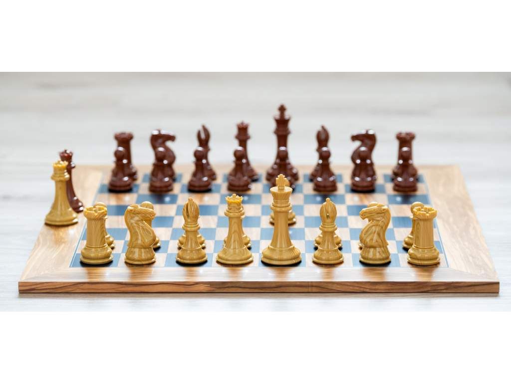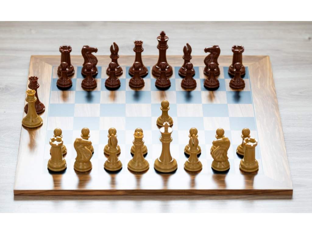 Šachovnice z tmavého olivového dřeva doplněná robustními a vyváženými živými figurami, které se vyznačují vysokou odolností. Hladký povrch šachovnice i figurek zajišťuje jedinečný zážitek ze hry šachu.