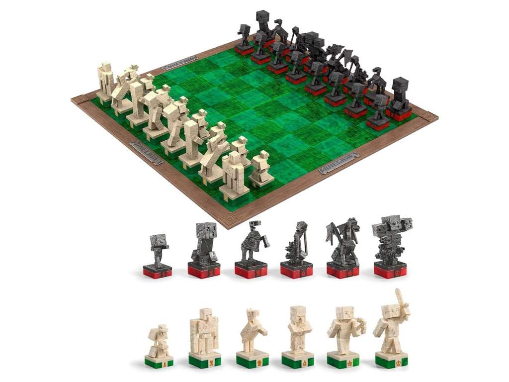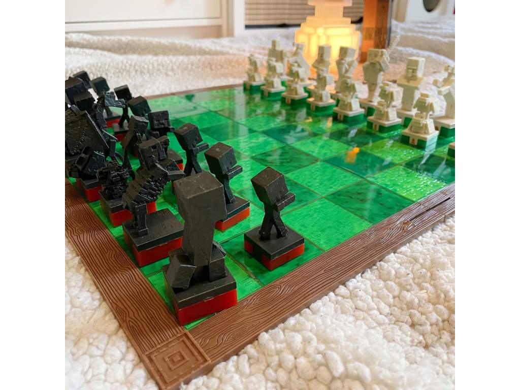 - Šachovnice o rozměrech 18″ x 18″ má dřevěný rám kolem šachovnice s texturou "trávy" v odstínech zelené barvy, obklopený logy Minecraftu v metalickém provedení, vhodný pro hru králů (a stevardů).