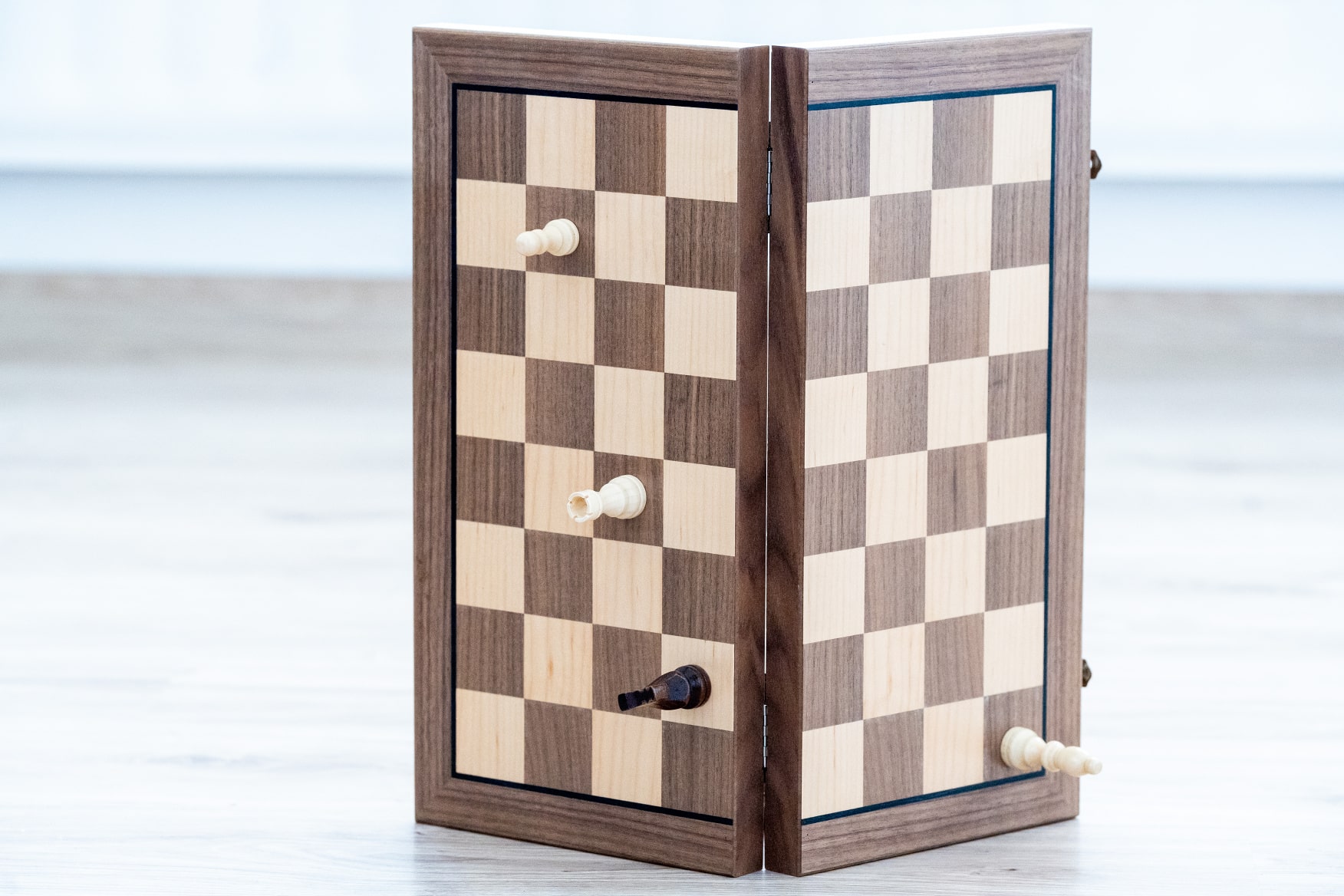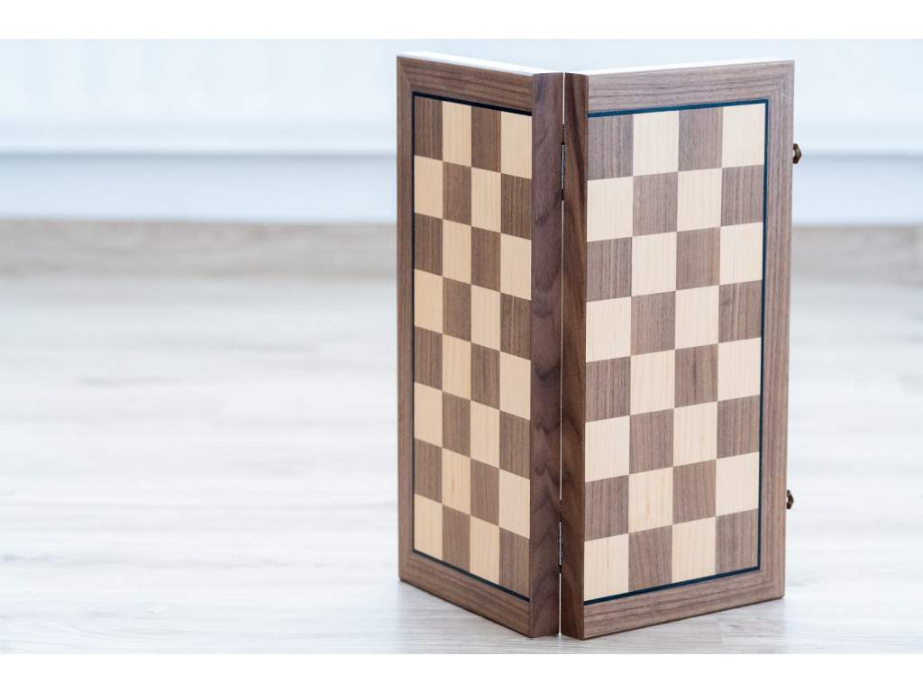 Skládací konstrukce umožňuje snadné uložení figurek uvnitř šachovnice, což zajišťuje jejich bezpečné přenášení a ochranu před poškozením.