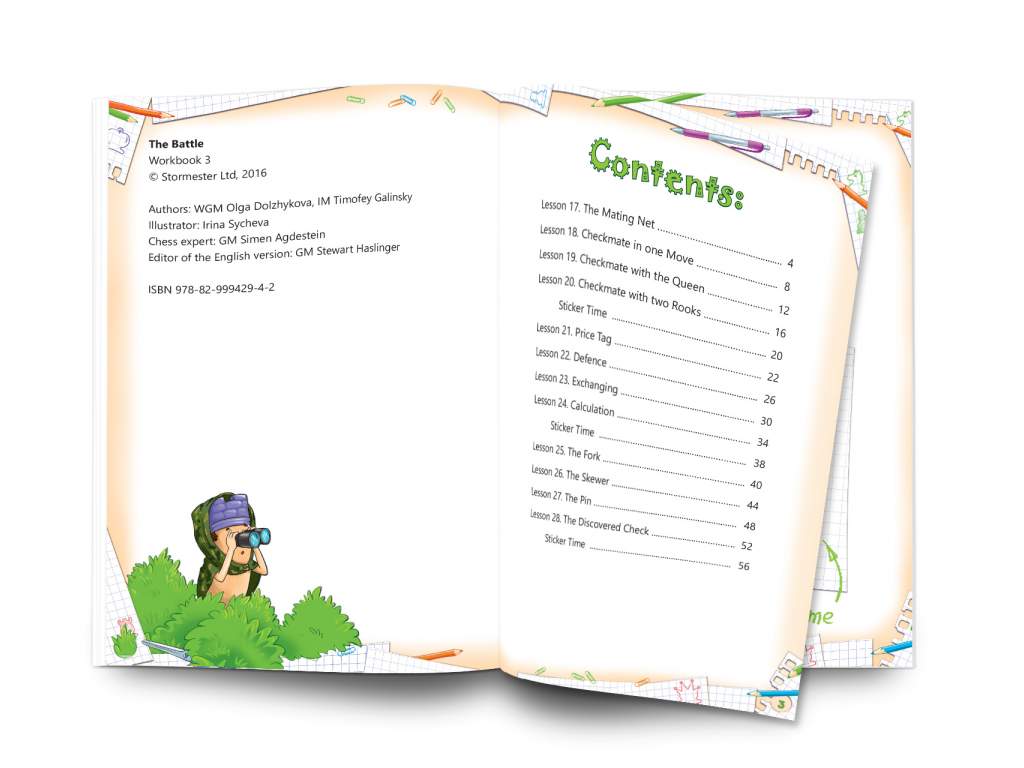 Workbook 3 “The Battle” covers lessons 17-28 of the course and provides a variety of tricky tasks to help you train your chess excellence.